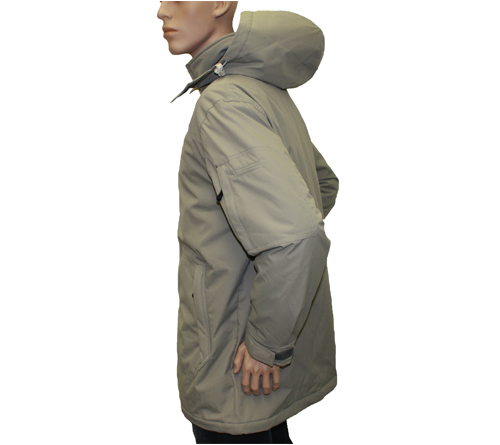 Features: Full zip front Storm flap Two cargo lower pockets with zippered side opening two zippered pockets on each shoulder Adjustable drawcord and toggle at hem Detachable hood Quilted tricot lining on interlock back